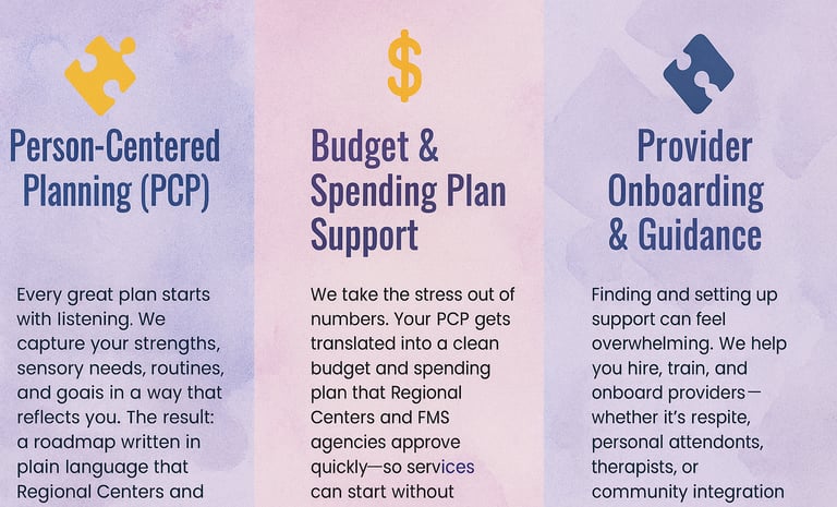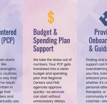 We take the stress out of numbers. Your PCP gets translated into a clean budget and spending plan that Regional Centers and FMS agencies approve quickly—so services can start without unnecessary delays.